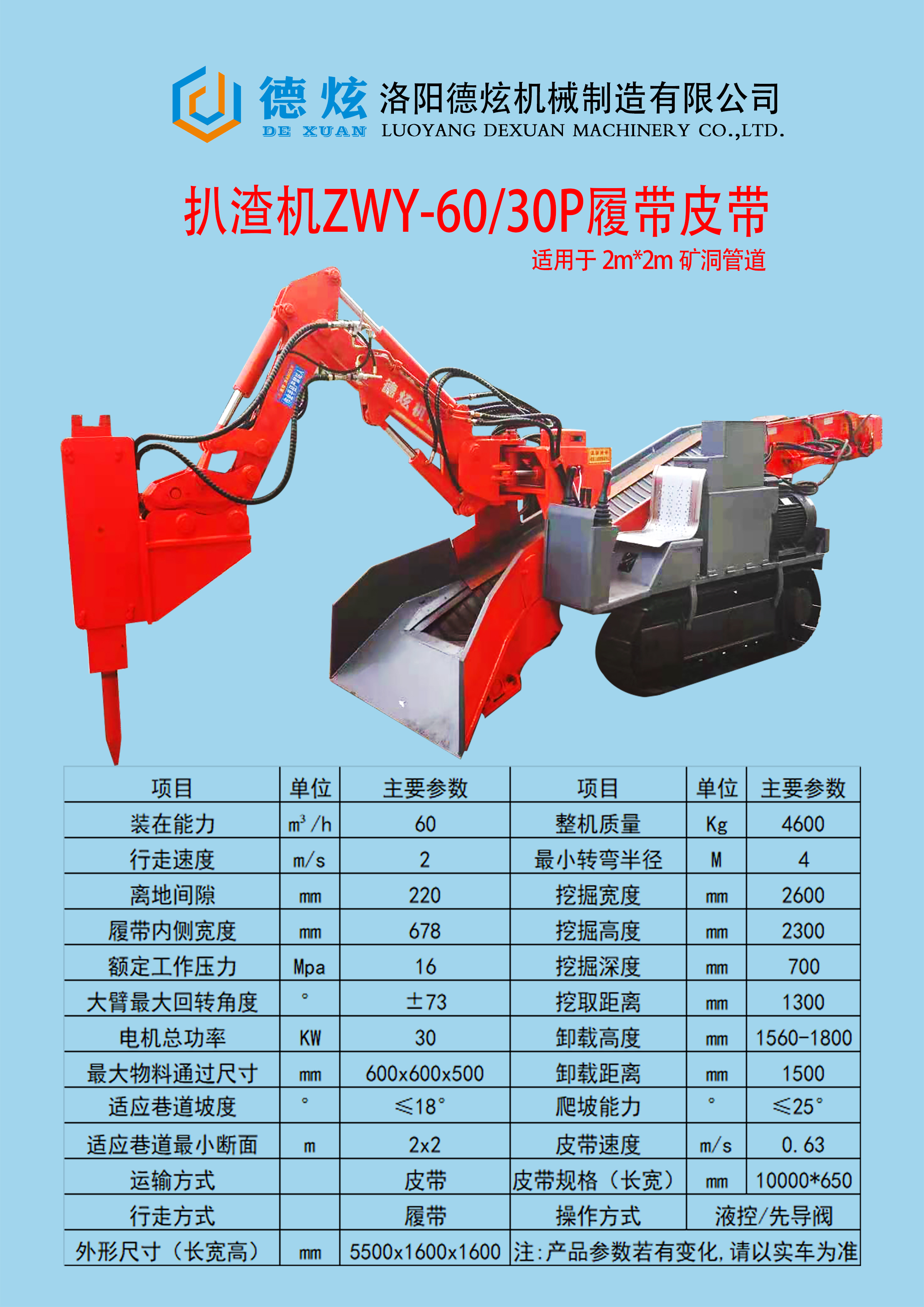 ZWY-60系列挖掘式裝載機(俗稱扒渣機、扒礦機),系輪胎式液壓馬達驅動行走,行走速度2.5千米/小時左右,其優(yōu)點在于轉場速度快、靈便,能用于更換工作面。前后輪液壓馬達驅動行走,推力大便于物料聚集,不需人工輔助清理工作面,減輕了工人的勞動強度。液壓(電動)滾筒皮帶輸送物料裝車,帶寬700mm的阻燃耐磨輸送帶,輸送速度可達0.8米/秒,輸送效率高,噪音低無污染,節(jié)能環(huán)保等特點。